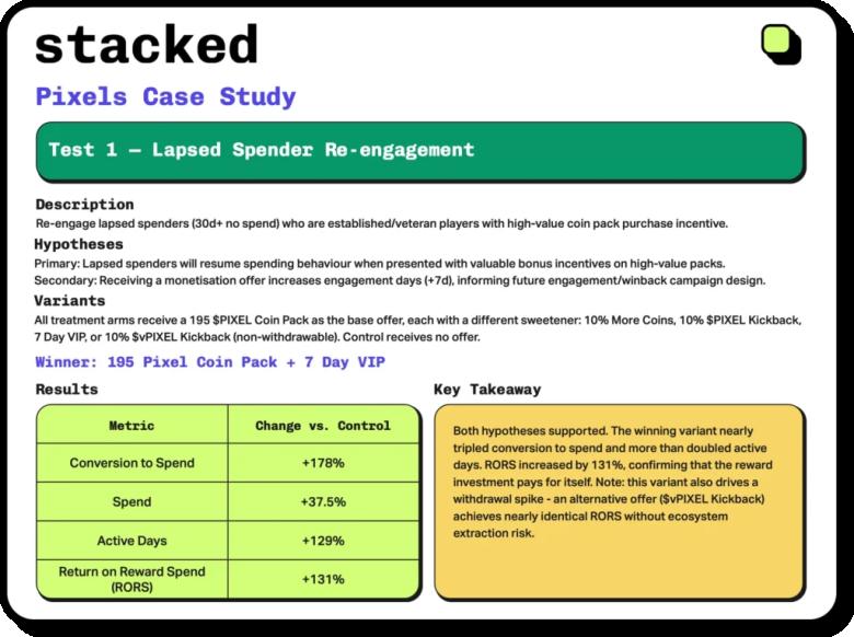 The operational data obtained by Pixels within the company reflects the effectiveness of this idea. In the strategy for re-engagement with disengaged users, the transfer rate of funds increased by 178%, and the number of active days increased by 129%. The return on investment related to advertising reached 131%.